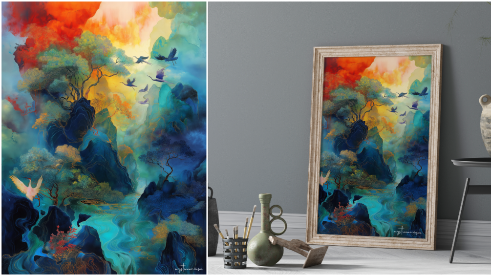 “Whispering Skies” invites you into a serene, dreamlike valley—where ancient trees glow with unseen energy and graceful birds soar through golden mist.