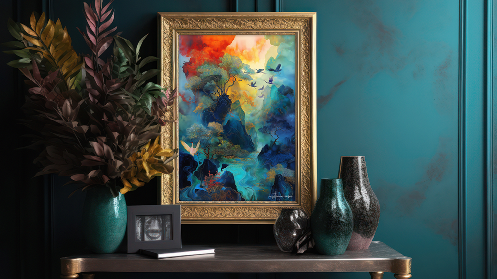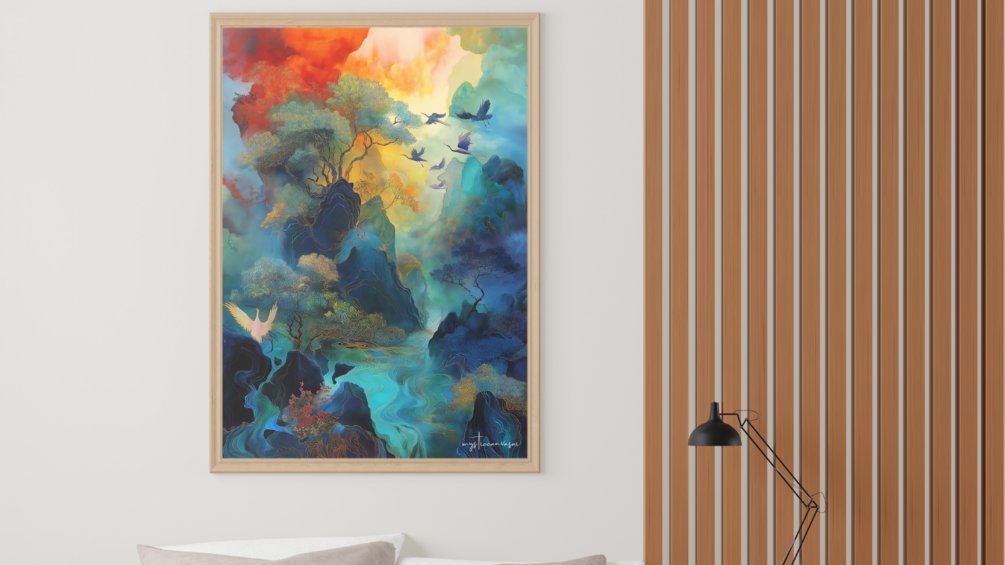 “Whispering Skies” invites you into a serene, dreamlike valley—where ancient trees glow with unseen energy and graceful birds soar through golden mist.