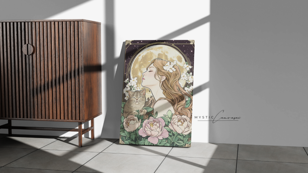 "Moonlight Serenity" isn't just a digital print — it's a moment captured between breath and bloom. A woman bathed in starlight drifts into stillness, her auburn hair dancing with the night wind, surrounded by blooming peonies and a soft, knowing cat. Behind her, the full moon glows like a guardian, watching over this sacred stillness.