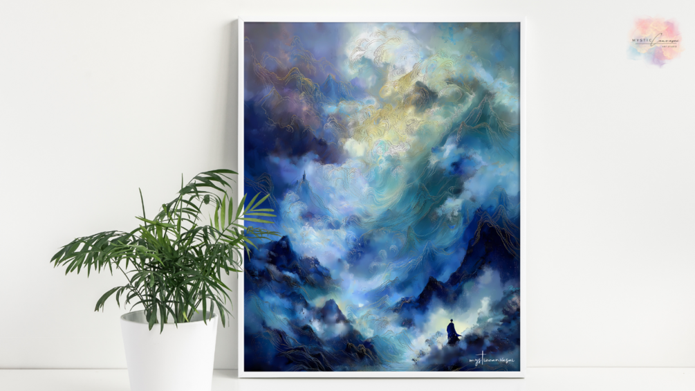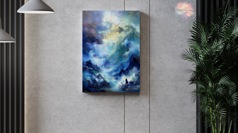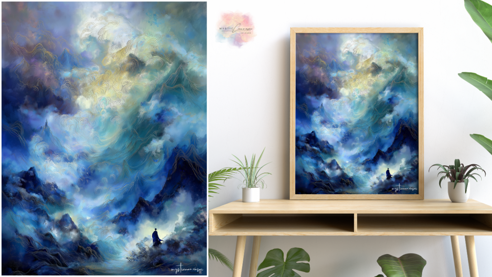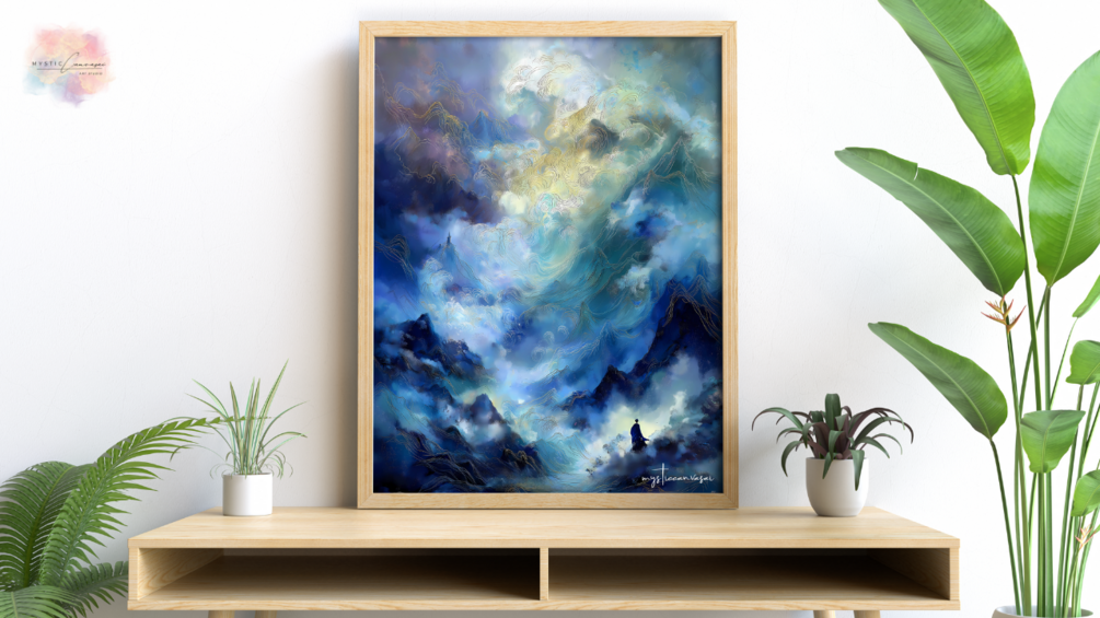 "Ethereal Horizons" captures the moment where the skies break open into a luminous world of dreams — a place where mountains breathe with mist and a lone wanderer stands at the edge of the infinite.